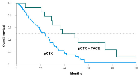 The median OS of 13.1 months from the time of unresectability reported here for patients receiving only pCTX is comparable with previous results [4,5]. Furthermore, the median OS of 26.2 months in patients who received TACE in addition to pCTX is consistent with the median OS of 28 months reported by Kiefer et al. [28].