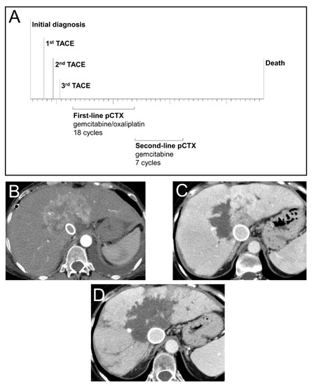 We included patients with a histologically confirmed diagnosis of unresectable iCCA, who had started pCTX at our tertiary center between January 2010 and December 2019, in our study. Patients were followed up until 31 December 2020. Patient data were collected from our institution’s electronic medical records and analyzed retrospectively. Complete blood count, blood chemistry, and the serological tumor markers carbohydrate antigen 19-9 (CA19-9) and carcinoembryonic antigen (CEA) were assessed before initiation of pCTX and during the course of treatment. After discussion in our multidisciplinary tumor board, selected patients received TACE in addition to pCTX. Response to treatment was assessed by computed tomography or magnetic resonance imaging at regular intervals. In the case of the tumor progression treatment was changed to next line chemotherapy or best supportive care.
