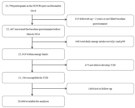 Up to December 2018, 22,790 participants had completed their baseline questionnaire. In order to assure at least 2 years of follow-up, we excluded 323 participants whose follow-up period was less than two years and nine additional months to account for the lag time in returning the questionnaire. We excluded 448 participants with total daily energy intake out of percentiles 1 and 99. We also excluded 475 participants not suitable for developing T2D (prevalent T2D, T1D and other type of diabetes, pancreatectomy, and with doubtful information in the additional confirmation questionnaire). Lastly, 1484 participants were lost to follow-up (retention: 93%). Finally, 20,060 participants were included in the analyses (Figure 1). The Institutional Review Board (IRB) of the University of Navarra approved the SUN project protocol. Voluntary completion of the first questionnaire was considered to imply informed consent.