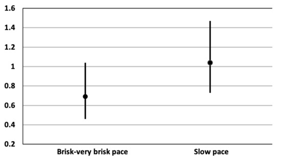 Adjusted * hazard ratios for T2D of the replacement of 1 h sitting time by 1 h of walking according to pace. * Adjusted for sex, soft drinks consumption (tertiles), smoking, family history of diabetes, prevalent hypertension, cancer, cardiovascular disease, snacking, Mediterranean diet score, and baseline overweight/obesity, stratified by decades of age and recruitment period. Additionally, adjusted for MPA and VPA in the replacement of 1 h sitting time by 1 h of slow pace model and for LPA and VPA in the replacement of 1 h sitting time by 1 h of the brisk/very brisk pace model.