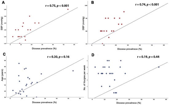 Relationship between risk factors and prevalence of COVID-19 among Clergy. (A) Disease prevalence with SBP; (B) disease prevalence with DBP; (C) disease prevalence with age; (D) disease prevalence with number of liturgies per week. SBP: systolic blood pressure; DBP: diastolic blood pressure.