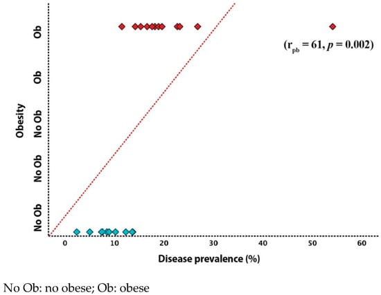 One hundred and one (39.8%) clergy were overweight, and one hundred and thirty-three (52.2%) were obese. Seventy-one (27.9%) clergy were on anti-hypertensive medications, sixty (23.5%) were treated for diabetes, sixty-seven (26.5%) were treated for dyslipidemia, and twenty-four (9.6%) had a history of coronary artery disease (Table 1). Hypertension measurements, taken at the time of data collection, correlated strongly with the prevalence of COVID-19, SBP (r = 0.78, p < 0.001), and DBP (r = 0.74, p < 0.01, Figure 2). Similarly, obesity strongly correlated with disease prevalence (rpb = 0.61, p = 0.002, Figure 3). No relationship was found between age, BMI, diabetes, or number of weekly served liturgies and the prevalence of COVID-19 (p > 0.05 for all, Table 2). We also tested the possible impact of dioceses with higher disease prevalence on the correlation analysis. In influence analysis, the relationship between diocese prevalence and SBP, DBP, age, and number of liturgies per week showed almost similar correlation, with only small reduction of magnitude with SBP and DBP (Supplementary Materials Figure S1).
