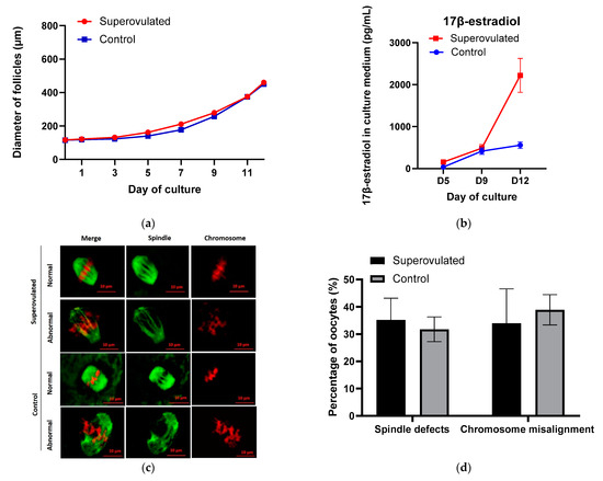 (a) Follicular growth curves during in-vitro culture; (b) 17β-estradiol secreted by individual follicles in the culture medium; (c) Representative images showing a normal or abnormal morphology of spindle and chromosome configurations in MII oocytes from control and superovulated groups after IVM. Spindle fibers (green) were detected by immunofluorescence for a-tubulin, while DNA (red) was stained with propidium iodide. Scale bar, 10 µm; (d) Percentages of MII oocytes with spindle defects or chromosome misalignment in control and superovulated groups.