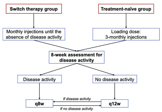 Follow-up was performed according to an in-house protocol for the follow-up of patients under brolucizumab and in accordance with the recommendation for patients under anti-VEGF injections (Stellungn./Empfehlungen DOG). Eyes were examined for detection of ocular-adverse events on days 7, 15, and 30 following the first injection (including OCT scans at day 15) and every month thereafter. After the loading dose, all treatment-naïve patients were assessed at 8 weeks: (i) If no disease activity (i.e., presence of fluid) was observed the patient still had an injection at 12-weeks, and was then reassessed every 12-weeks with another systematic injection (q12w). In cases of disease activity in a follow-up visit, the delay between injections was shortened to 8 weeks. (ii) If fluid was observed, the patient had an injection at 8 weeks and was then reassessed 8-weekly with a systematic injection (q8w). If no fluid was detected at an 8-week follow-up, extension of injections and follow-up could be done at 12 weeks. For the switch-therapy group, patients were followed monthly after the first injections for possible reinjection in case of disease activity. Once the macula was dry on SD-OCT, all switch patients were assessed at 8 weeks and were reinjected following the above recommendations (Figure 1). Retreatment criteria were based on comparisons with the previous month’s examination and retreatment administered if any one criterion of disease activity was considered to be positive [7,10]. Intravitreal injections were performed using a standardized aseptic technique.