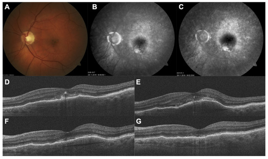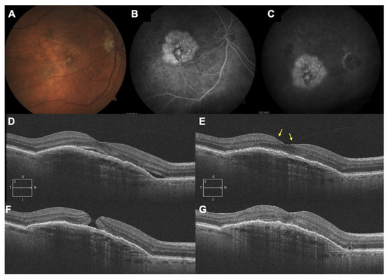 A 78-year-old male patient had been treated for neovascular AMD with aflibercept and ranibizumab and had received 50 injections overall prior to switch to brolucizumab. (A–C) Multimodal imaging at baseline showing a large subfoveal lesion. (D) SD-OCT immediately prior to initiation of brolucizumab therapy. (E) SD-OCT 8 weeks after the first brolucizumab injection showing a total resorption of the subretinal fluid but also an evident vitreomacular adherence (arrows). (F) SD-OCT 15 days after receiving his 5th brolucizumab injection, showing macular hole. SD-OCT after the macular hole surgery. (G) C-late phase FFA.