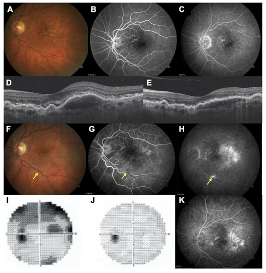 - Spaide, R.F.; Jaffe, G.J.; Sarraf, D.; Freund, K.B.; Sadda, S.R.; Staurenghi, G.; Waheed, N.K.; Chakravarthy, U.; Rosenfeld, P.J.; Holz, F.G.; et al. Consensus Nomenclature for Reporting Neovascular Age-Related Macular Degeneration Data: Consensus on Neovascular Age-Related Macular Degeneration Nomenclature Study Group. Ophthalmology 2020, 127, 616–636. [Google Scholar] [CrossRef]