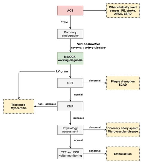 Proposed approach to myocardial infarction with non-obstructive coronary artery disease diagnosis. Flowchart is explained in the text. ACS indicates acute coronary syndrome; ARDS, acute respiratory distress syndrome; CMR, cardiac magnetic resonance; ESRD, end stage renal disease; MINOCA, myocardial infarction with non-obstructive coronary artery disease; OCT, optical coherence tomography; SCAD, spontaneous coronary artery dissection; and TEE, trans esophageal echocardiography.