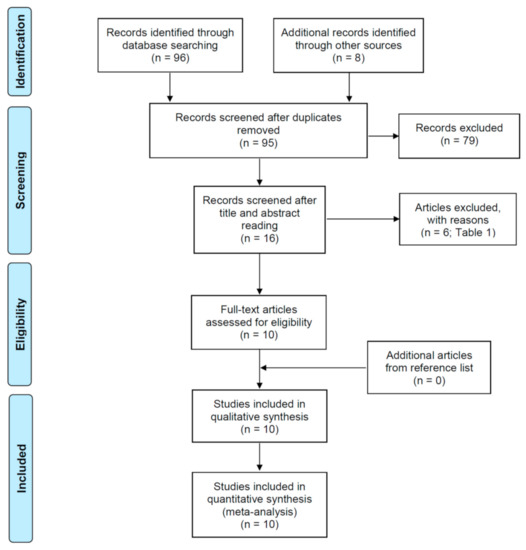 The flow diagram of the search strategy is shown in Figure 1. The initial search resulted in 96 published studies from different databases, together with 8 additional studies identified through other sources. Nine studies were excluded as they were duplicates. Then, from 95 eligible papers, the analysis of titles and abstracts resulted in the inclusion of 16 studies of interest. The reason for the rejection of 79 articles was that they did not match the inclusion criteria, as they did not relate coronal preflaring with the EAL accuracy in the determination of the working length. After comprehensive reading, 10 full-text articles were selected for the systematic review and meta-analysis [20,21,22,23,24,25,26,27,28,29], and 6 articles were excluded for different reasons [10,30,31,32,33,34] (Table 1).