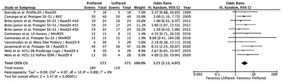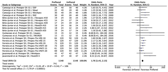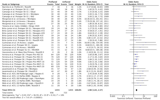 The meta-analyses were calculated with the 5.4 RevMan software (Review Manager Web. The Cochrane Collaboration, 2019. Available at revman.cochrane.org, accessed on 24 May 2021). The studies did not conduct the assays using the same methodology—on the contrary, different types of preflaring files and EALs were used. The inverse variance method with random effects was thus performed to determine the pooled OR and its 95% CI. Meta-analyses were represented with a forest plot [17].