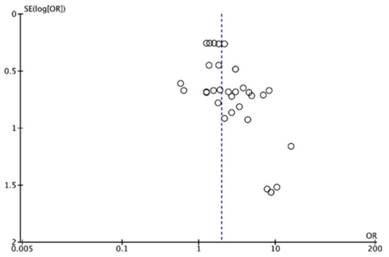 Funnel plot. Each dot indicates one of the 34 results from the ten included studies. The y axis represents the standard error (SE) of the OR, and the x-axis represents the OR calculated in the meta-analysis.