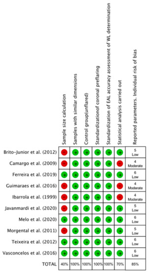 The methodological quality and the risk of bias of each study were assessed (Figure 6). According to the parameters considered in the analysis, three of the included studies presented moderate risk of bias [20,21,25], three others reported five of the six analyzed parameters [22,23,28], meaning they were classified as low risk of bias, and the remaining four studies [24,26,27,29] reported all of the analyzed parameters, and therefore they were also considered as low risk of bias. In the present analysis, four of the six parameters assessed (samples with similar dimensions, control group (unflared), standardization of coronal preflaring, and standardization of EAL accuracy assessment of WL determination) were reported in all the included studies. The total percentage of parameters reported in the 10 included studies was 85%, indicating a low total risk of bias.