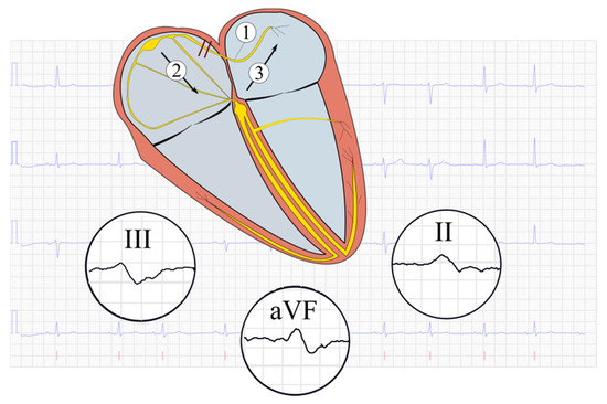 Description of the atrial depolarization route in advanced interatrial block with zoomed images of the P waves in inferior leads (II, aVF and III), in the case of a block in Bachmann’s bundle (1). Normally, depolarization of the atria travels through the right and left atria through internodal tracts, e.g., Bachmann’s bundle. Since impulse propagation from the right atrium to the left atrium is blocked, the right atrium will be depolarized first (2) followed by a retrograde depolarization of the left atrium (3), resulting in biphasic P waves in inferior leads. Modified from [10], reprinted with permission.