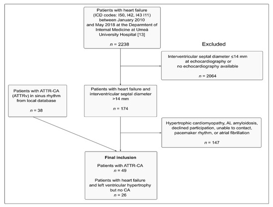 Flowchart of patient inclusion and exclusion. Abbreviations: ICD—International Classification of Diseases; ATTR-CA—transthyretin cardiac amyloidosis, ATTRv—amyloid transthyretin variant; AL—amyloid light-chain.