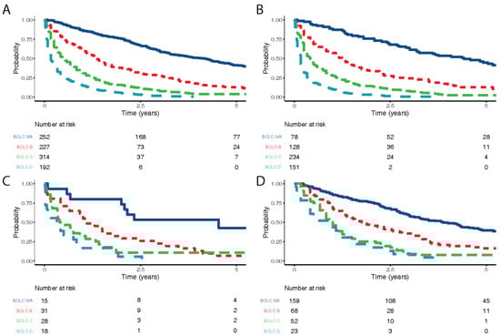 Overall survival by BCLC stage. (A) For all patients included in the study, (B) for patients never entered into surveillance, (C) overall survival by BCLC stage for those not adherent to surveillance, (D) overall survival for those adherent with surveillance.
