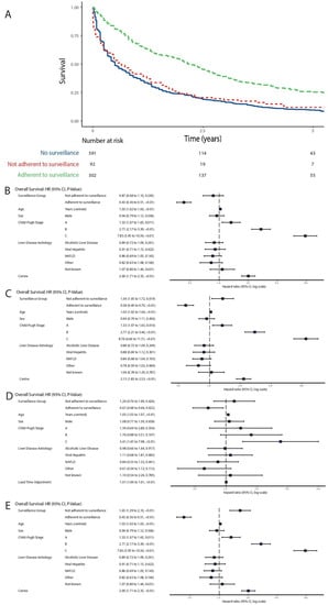 Over half the patients in the adherent with surveillance group (52.6%, 159/302) were diagnosed with BCLC stage 0/A disease, compared to 16.3% (15/92) in the not adherent group and 13.5% (78/591) in the no surveillance group (p < 0.001; Table 3). In both the non-adherent to surveillance and not under surveillance groups, disease at presentation was more advanced. Patients with higher BCLC stages had poorer overall survival, which was consistent across all surveillance groups (Figure 1).