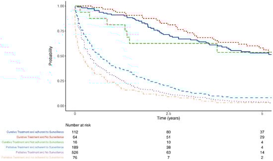 The following are available online at https://www.mdpi.com/article/10.3390/jcm10132770/s1, Figure S1: Kaplan–Meier for symptom transition method. A—70 days, B—140 days, C—270 days, D—1.57 years, E—2.66 years, Figure S2: Kaplan–Meier plot by surveillance adherence, with adjustment for counterfactual method, Table S1: Characteristics by Centre, Table S2: Stage of disease by centre and surveillance adherence, Table S3: Predictors of adherence to surveillance (including centre).