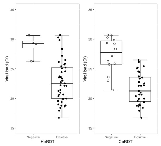 The performance of both CoRDT and HeRDT was evaluated according to the criteria of sensitivity and specificity with a corresponding 95% confidence interval (95% CI). Qiagen RT-PCR was considered as the gold standard for this evaluation. Sensitivity was calculated for two groups: (1) on positive NP swabs including all Ct values and (2) in NP swabs with RT-PCR cycle threshold (Ct) values ≤31. This cut-off was used in the host laboratory to assist with the interpretation of Ct: a positive sample with a Ct value >31, equivalent to a viral load ≤1000 copies/mL, was considered to be a weakly positive result [8,9,15]. The agreement between the two techniques was evaluated using Cohen’s kappa coefficient, κ, with a corresponding 95% CI. Analyses were performed using the R software [19].