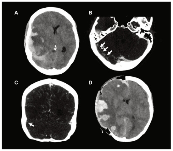 (A) Preoperative CT scan which demonstrates parenchymal stasis hemorrhage and a spontaneous acute subdural hematoma with associated midline shift and impending herniation. (B,C) Axial and coronal images, respectively, which demonstrate marked sinus vein thrombosis (arrows) on CT venography (CTV). (D) Postoperative CT scan after decompressive craniectomy.
