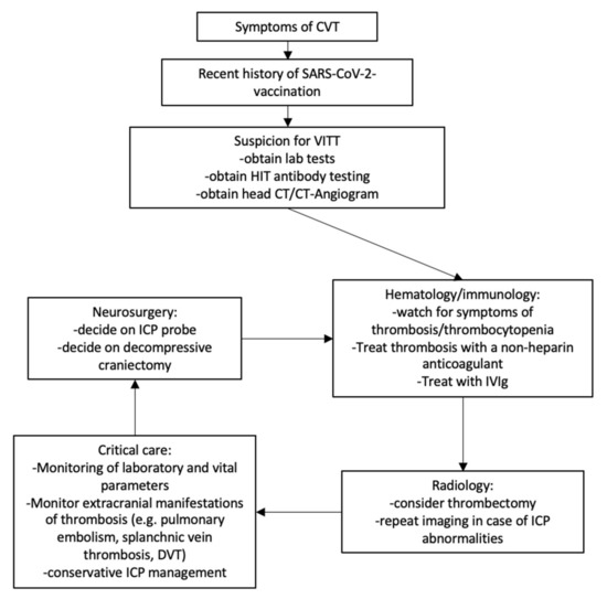 Further laboratory diagnostics for VITT should always be carried out before IVIG is administered, as high doses of immunoglobulins can lead to a false negative test result. The following procedure should be followed in the event of a suspected VITT [29]: Rapid interdisciplinary coordination regarding further diagnostics (imaging), therapy and further inpatient care. Immediately stop any heparin therapy and start of immunomodulatory therapy with IVIG therapy 1 g/kg bodyweight for two days [29,30]. If thrombosis is present, initiation of anticoagulation may be warranted (after interdisciplinary consultation, depending on thrombocytopenia and imaging performed), mainly with argatroban (Argatra®). As an alternative to argatroban, bivalirudin, fondaparinux, and rivaroxoban were described as a potential treatment for VITT following the ChAdOx1 nCov-19 vaccination [9]. In particular, to further validate potential options to support impaired coagulation in patients with CVT/ICH and VITT (e.g., tranexamic acid, desmopressin, recombinant factor VIIa) [31], future studies addressing the potential systemic effects of SARS-CoV-2 vaccination on the coagulation system are clearly needed to help stratify risk and determine the optimal vaccination strategy for patient at risk for the development of VITT.