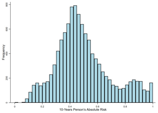 Absolute risk: The histogram shows the person’s absolute risk calculated for the study cohort using the score. About 67% of workers present a cumulative risk larger than or equal to 0.4; therefore, the risk of 40% appears to be a good threshold for the discrimination of high-risk workers.