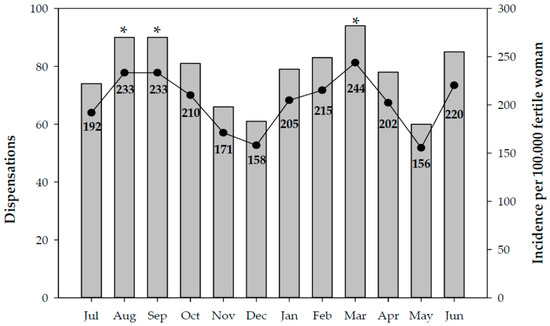 Number of EC dispensations and cumulative incidence per month. Catalonia, 2018–2019. Significant differences: * vs. the incidence in December (p < 0.05).