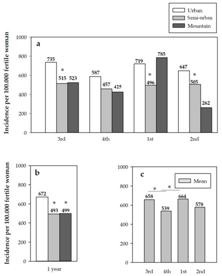 (a) Quarterly cumulative incidence by type of geographical area; (b) annual cumulative incidence by type of geographical area; (c) quarterly cumulative incidence in Catalonia. Significant differences: (a,b) * vs. urban area (p < 0.05); (c) * p < 0.05.
