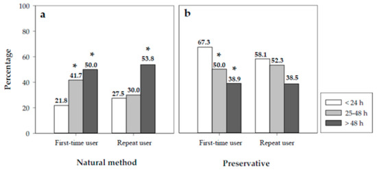 Percentages of first-time users and repeat users according to the time of collection of the medica-tion and their contraceptive behavior: (a) natural method, (b) preservative. Significant differ-ences: * vs. < 24 h (p < 0.05).