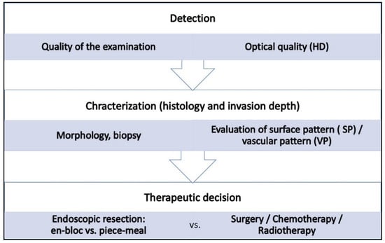 - Oyama, T.; Inoue, H.; Arima, M.; Momma, K.; Omori, T.; Ishihara, R.; Hirasawa, D.; Takeuchi, M.; Tomori, A.; Goda, K. Prediction of the invasion depth of superficial squamous cell carcinoma based on microvessel morphology: Magnifying endoscopic classification of the japan esophageal society. Esophagus J. Jpn. Esophageal Soc. 2017, 14, 105–112. [Google Scholar] [CrossRef] [Green Version]