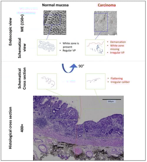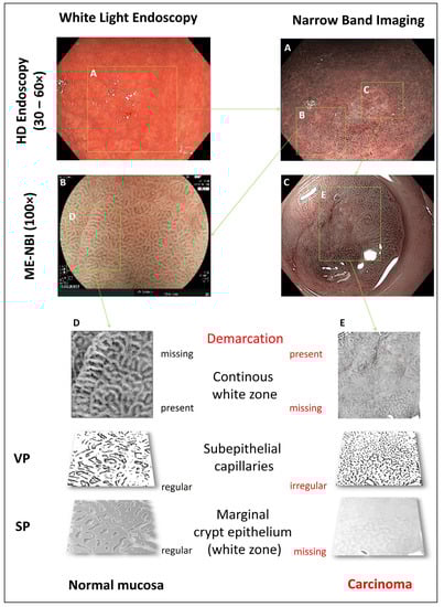 - Inoue, H.; Kaga, M.; Ikeda, H.; Sato, C.; Sato, H.; Minami, H.; Santi, E.G.; Hayee, B.; Eleftheriadis, N. Magnification endoscopy in esophageal squamous cell carcinoma: A review of the intrapapillary capillary loop classification. Ann. Gastroenterol. 2015, 28, 41–48. [Google Scholar] [PubMed]