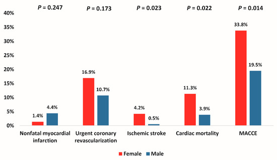 The female patients had significantly higher unadjusted rates of ischemic stroke (4.2%, n = 3 vs. 0.5%, n = 1, p = 0.023) and cardiac mortality (11.3%, n = 8 vs. 3.9%, n = 8, p = 0.022) during the follow up, while there was no difference in the rates of nonfatal myocardial infarction and urgent coronary revascularization. Importantly, MACCE occurred significantly more often in the female group (33.8%, n = 24 vs. 19.5%, n = 40, p = 0.014) (Figure 1).