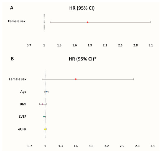 When looking at the female sex as a predictor variable for MACCE, it was significantly associated with an increased incidence of MACCE in the univariate analysis (HR 1.86, 95%CI 1.12–3.09, p = 0.014) (Figure 2A). However, this difference became statistically non-significant after the multivariable adjustment for age, LVEF, eGFR and BMI (HR 1.60, 95%CI 0.94–2.73, p = 0.083) (Figure 2B).