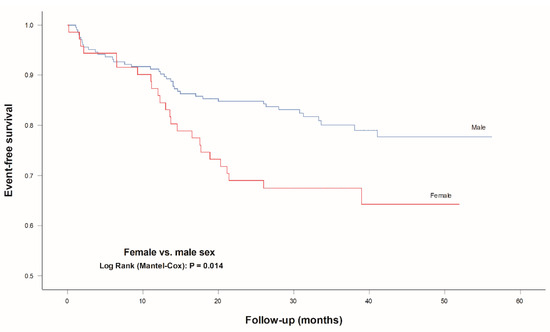The cumulative incidence of MACCE was higher in female patients with earlier MACCE occurrence during follow-up (38.71, 95%CI 34.31–43.10 vs. 47.33, 95%CI 44.83–49.82 months, p = 0.014) (Figure 3).