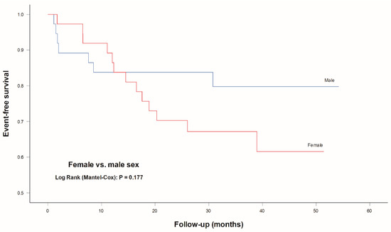 A total of 300 patients were initially enrolled in the study protocol, while 276 completed the follow-up, including 71 female and 205 male patients. The female patients were older (median of 69.0 vs. 63.0 years, p = 0.008) and had lower values of BMI (median of 26.3 vs. 28.2 kg/m2, p < 0.001). When looking at the laboratory parameters, the female patients had lower values of Hgb (132.13 ± 13.39 vs. 144.39 ± 14.86 g/L, p < 0.001) and eGFR (76.44 ± 22.43 vs. 94.04 ± 27.91 mL/min, p < 0.001). Importantly, there was no difference in the follow-up duration between the female and male patients (median of 30.1 vs. 33.1 months, p = 0.083, respectively). The other baseline characteristics are presented in Table 1.