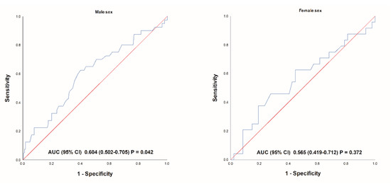 When evaluating the performance of the GRACE score for the prediction of MACCE, it showed inferior AUC values in the female group compared to that in male patients (0.565, 95% CI 0.419–0.712, p = 0.372 vs. 0.604, 95% CI 0.502–0,705, p = 0.042, respectively) (Figure 5).
