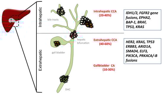 Biliary tract cancer (BTC) represents the second-most common primary liver malignancy, with an estimated incidence rate of 6/100,000. BTC can be classified by anatomic localization into intrahepatic cholangiocarcinoma (iCCA), perihilar and distal or extrahepatic cholangiocarcinoma (eCCA), and gallbladder carcinoma (GBCA) (Figure 1). Surgical resection is the only potentially curative treatment approach. However, most patients are diagnosed at advanced stages, when surgical and loco-regional therapies are not feasible, which overall renders BTC prognostically dismal [1,2]. Even following R0-resection, recurrence rates are high, with 3-year recurrence-free survival (RFS) rates below 30% [3]. At advanced stages, median overall survival (mOS) is historically described not to exceed 12 months in unselected patients, underlining the urgent need for effective systemic therapies [4].