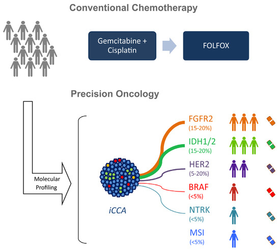 Conventional and precision oncological treatment approaches in advanced intrahepatic cholangiocarcinomas (iCCAs). proto-oncogene B-Raf (BRAF); human epidermal growth factor receptor 2 (Her2); Fibroblast Growth Factor Receptor gene 2 (FGFR 2), Isocitrate dehydrogenase 1 and 2 (IDH1/2); Neurotrophic tyrosine receptor kinase (NTRK); microsatellite instability (MSI).