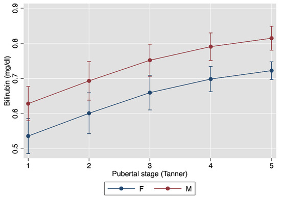 Association between bilirubin and pubertal status. See Table 2 for the underlying linear regression model.