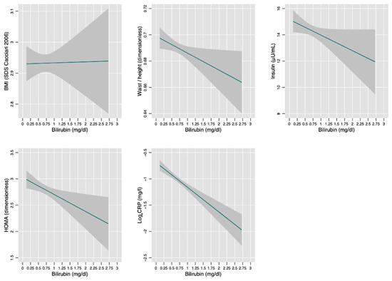 Bilirubin levels were inversely associated with waist:height ratio (p < 0.05), HOMA-IR (p < 0.05), and CRP (p < 0.001) (Table 3). However, these associations were weak and of doubtful clinical relevance. An inverse association between serum bilirubin and HOMA-IR has been, nonetheless, previously reported in adults and children [57,58].