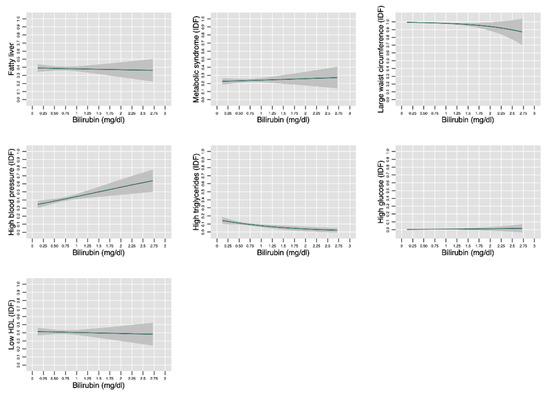 Bilirubin was not associated with FL, MS, high glucose and low HDL, while it was inversely associated with large waist circumference, high blood pressure, and high triglycerides. However, as can be clearly seen from the probability plots given in Figure 4, these associations were weak, with the possible exception of that with high blood pressure, which had, nonetheless, very wide confidence intervals and was, thus, very imprecise at the higher values of bilirubin.