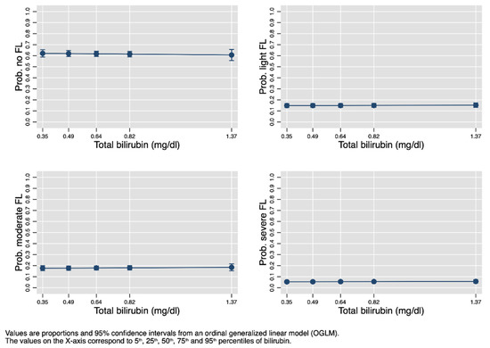Figure 5 plots the univariable association between FL degree and bilirubin as estimated by OGLM (model not shown). The figure clearly shows that the frequency of all degrees of fatty liver (none, light, moderate, and severe) is constant across a range of bilirubin values comprised between the 5th and the 95th internal percentiles.
