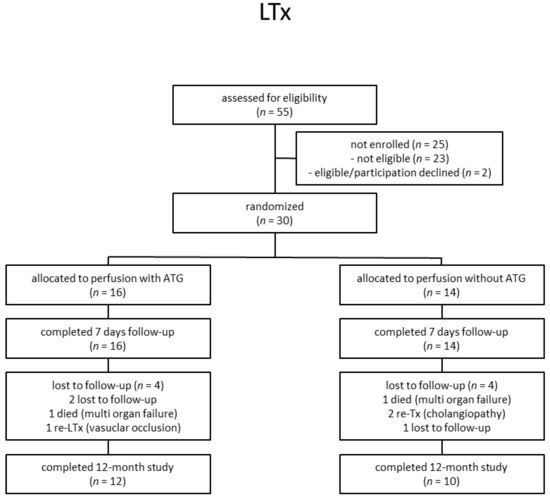 From 2012 to 2015, a total of 55 LTx recipients were assessed for eligibility (Figure 1). In total, 30 liver participants were eligible and enrolled in the study. Out of these 30 patients, 16 patients were allocated to receive a liver transplant perfused with ATLG, whereas 14 patients were randomly assigned to receive a liver perfused with saline. No significant differences regarding descriptive statistics were observed between ATLG and control patients (Table 1). In both groups, n = 4 patients were lost to follow-up, and n = 12 (AP) and n = 10 (CP) patients completed the observation period after 12 months (Figure 1). Duration of hospital stay was comparable between ATLG and control patients (Table 1). Surgical, biliary, infectious, and immunological complications were comparable, as summarized in Table 2.