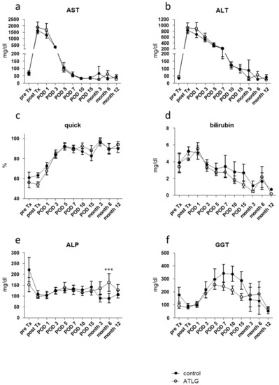 Functional liver parameter after liver transplantation. Results of routine blood analysis for the clinical parameters (a) alanine aminotransferase (ALT), (b) aspartate aminotransferase (AST), (c) Quick value, (d) bilirubin, (e) alkaline phosphatase, and (f) gamma-glutamyl transferase (GGT) are comparable for livers perioperatively perfused with ATLG as compared with control livers. ATLG: open circles; control: filled circles. data are presented as mean values ± SEM; *** p ≤ 0.001; ALP—alkaline phosphatase; ALT—alanine transaminase; AST—aspartate transaminase; ATLG—anti-human T-lymphocyte globulin; GGT—gamma-glutamyltransferase; POD—postoperative day.