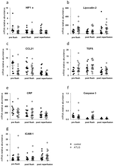 Inflammation-related candidate gene expression in liver biopsies taken before ATLG perfusion, after ATLG perfusion, and one hour post-reperfusion. Real-time quantitative PCRs of mRNA of whole tissues were performed at different time points perioperatively. Selected candidate markers (a) HIF1a, (b) Lipocalin-2, (c) CCL21, (d) TGFβ, (e) CRP, (f) Caspase 3, (g) ICAM-1), which play major roles in the context of inflammation, and cell adhesion did not show significant differences before perfusion with ATLG (pre-flush), directly after perfusion with ATLG (post-flush), or following reperfusion (post-reperfusion) between ATLG-perfused livers and control livers. ATLG: open circles; control: filled circles. Data are presented as mean ± SEM; ATLG—anti-human T-lymphocyte globulin; CCL21—chemokine (C-C motif) ligand 21; CRP—C-reactive protein; HIF1a—hypoxia-inducible factor 1-alpha; ICAM-1—intercellular adhesion molecule 1; TGFβ—transforming growth factor-beta.