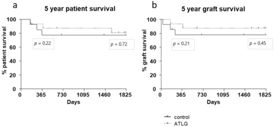 Patient and graft survival. No differences in (a) patient and (b) graft survival were detected between ATLG-perfused livers and control-perfused livers. The displayed p-values indicate 1- and 5-year survival. (AP: 93% 1-year patient survival vs. CP: 77% 1-year patient survival, p = 0.220; AP: 80% 5-year patient survival vs. CP: 77% 5-year patient survival, p = 0.718).