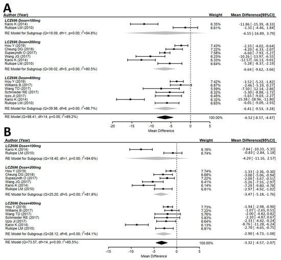 Forest plot of (A) msSBP and (B) msDBP. Comparisons of LCZ696 with a control group. msSBP, mean sitting systolic blood pressure; msDBP, mean sitting diastolic blood pressure.