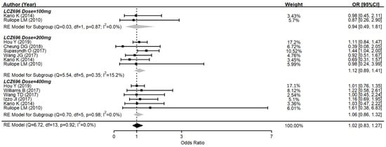 Several drug-related AEs were reported after therapy in nine studies. The pooled data showed no significant difference between the AE rates of LCZ696 and the placebo (OR = 1.02, 95% CI: 0.83–1.27, p = 0.90) (Figure 4). In subgroups, 100 mg of LCZ696 showed an odds ratio of 0.94 (95% CI: 0.49–1.81, p = 0.86); 200 mg of LCZ696 showed an odds ratio of 1.12 (95% CI: 0.89–1.41, p = 0.34); while 400 mg of LCZ696 had an odds ratio of 1.06 (95% CI: 0.86–1.32, p = 0.57). There was also no significant difference between all subgroups according to different LCZ696 doses. The commonly reported AEs in the LCZ696 groups were nasopharyngitis, headache, dizziness, upper respiratory tract infection, diarrhea, and hyperuricemia. All of which were minimal and mild.