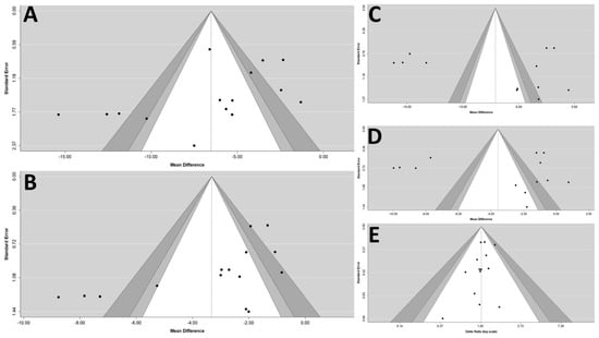 Funnel plots of (A) msSBP, (B) msDBP, (C) maSBP, (D) maDBP, and (E) adverse events. maSBP, mean ambulatory systolic blood pressure; maDBP, mean ambulatory diastolic blood pressure; msSBP, mean sitting systolic blood pressure; msDBP, mean sitting diastolic blood pressure.