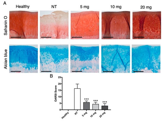 Histologic evaluation of bevacizumab on articular cartilage morphology. (A) Safranin O and Alcian blue staining of articular cartilage. The NT group showed the most evident degenerative changes, with reduced staining intensity, surface disruption, and chondrocyte loss. Otherwise, groups treated with bevacizumab displayed fewer osteoarthritic alterations. Scale bars = 200 μm. (B) The OARSI score calculated for the Safranin O–fast green cartilage sections confirmed these findings, with significantly decreased values for the groups injected with bevacizumab. *** p < 0.001, bevacizumab 5, 10, and 20 mg compared to the NT group. Data are expressed as mean ± SD. NT = not treated.