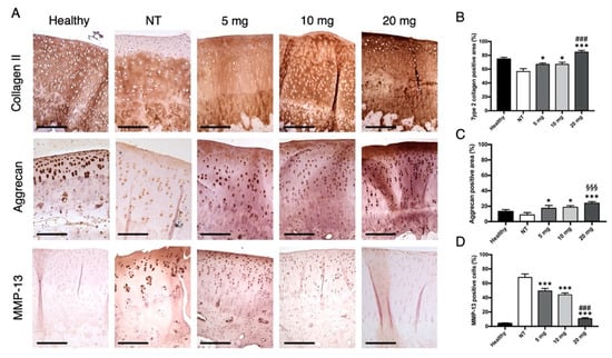 3.2. Type 2 Collagen, Aggrecan, and MMP-13 Expression in Articular Cartilage
