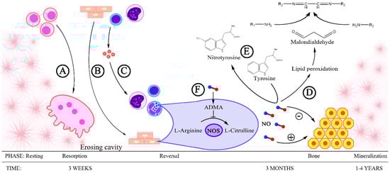 Nitric oxide and its activity indicators in the process of bone fracture healing: A—Preosteoclasts fuse to form osteoclasts, the cells that participate in the resorption of bone tissue. B—In endothelial cells, monocytes, and lymphocytes, the expression of endothelial nitric oxide synthase is increased, which is demonstrated by the production of nitric oxide (NO). NO intensifies the process of bone formation from osteoblasts. C—Endothelial cells, monocytes, and lymphocytes constitute a source of proinflammatory cytokines, which activate neutrophils and macrophages. The expression of inducible nitric oxide synthase is intensified in these cells, leading to the generation of large amounts of NO. High NO concentration has an inhibitory effect on the process of osteoblast differentiation and bone formation. D—NO intensifies lipid peroxidation, as a result of which malonyldialdehyde is produced, which participates in the formation of aminoiminopropene Schiff bases. E—NO is one of the factors that nitrate the tyrosine phenolic units leading to the formation of nitrotyrosine. F—ADMA, an endogenous inhibitor of eNOS.
